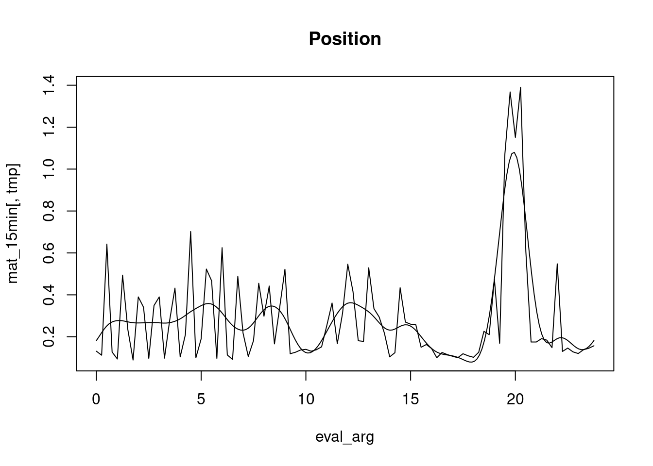 # check if any server is onlineif (!is.null(available_workers)) {# then use it/themplan(strategy ="cluster",workers =c(rep("localhost", num_cores), available_workers) )} else {# else use this machine onlyplan(strategy ="multisession", workers = num_cores)}# this part is fast# the purpose of this part is to ...step01_fdPar <-lapply(X = lambda_grid,FUN = \(x) fdPar(fdobj = fourier_basis,Lfdobj = harmonic_accerlation,lambda = x ))# WARNING: this part can be slow# leverage additional computing resources if available/desiredstep02_smooth <-future_map(.x = step01_fdPar,.f =function(x) smooth.basis(eval_arg, mat_15min, x),.progress =FALSE)# this part is fast# the purpose of this part is to ...fda_gcv <-vapply(X = step02_smooth,FUN = \(x) sum(x[["gcv"]], na.rm =TRUE),FUN.VALUE =numeric(1))# from the gcv values above, compute the lambda argmin (min gcv value)# the lambda argmin is used to find the optimal lambda valuemin_lambda <- lambda_grid[which.min(fda_gcv)]# apply optimal lambda# the purpose of this step is ...min_lambda_fda_fdPar <-fdPar(fdobj = fourier_basis,Lfdobj = harmonic_accerlation,lambda = min_lambda)# the purpose of this step is ...fda_fd_smooth <-smooth.basis( eval_arg, mat_15min, min_lambda_fda_fdPar)# apply previously defined names to the datafda_fd_smooth[["fd"]][["fdnames"]] <- fdaNames# house cleaning: parallelization: endplan(strategy ="sequential")
