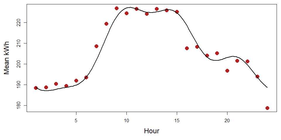 The figure above is a helpful illustration taken from a presentation I gave at an energy-professionals meetup. The 24 red data points represent the mean consumption by hour for a period of time, say the last two years. The black curve was fitted to the points using functional data analysis.