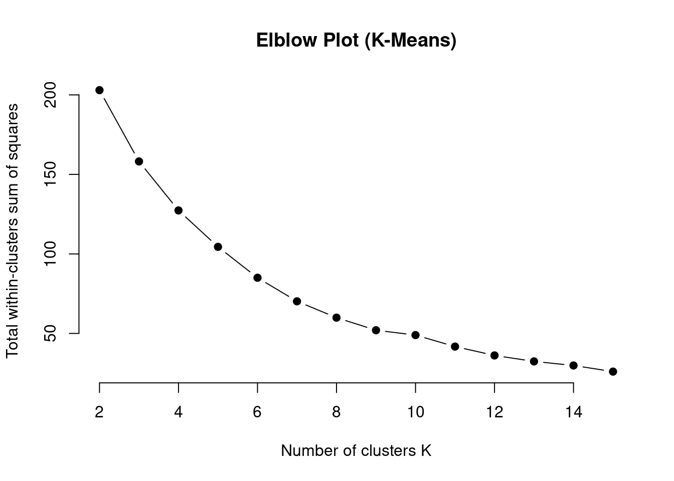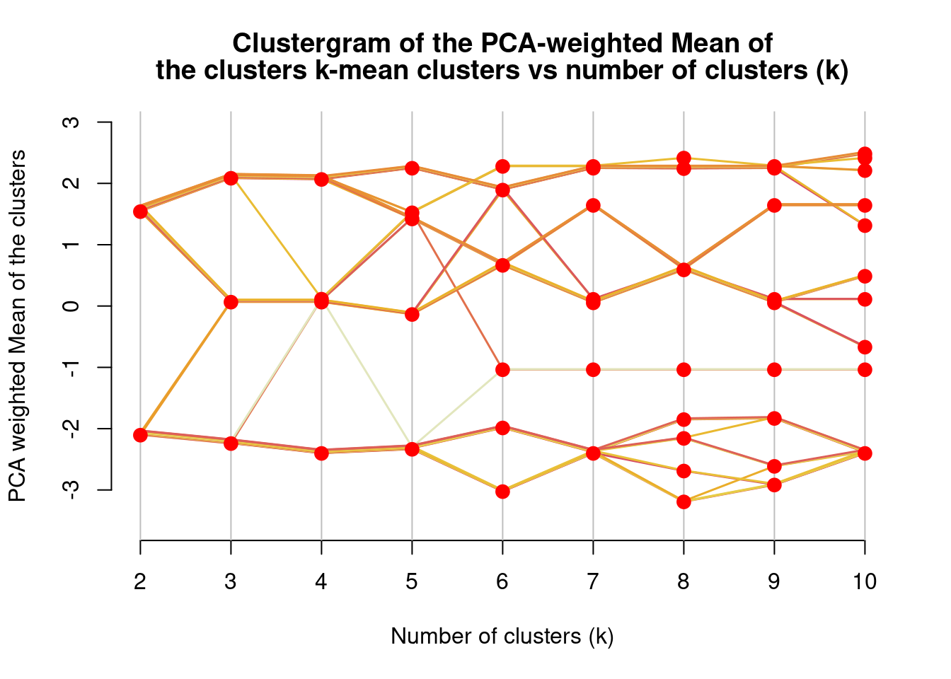 Have you ever heard of a clustergram? See this link for details. In summary, it’s another way to visualize what value K should take on. There isn’t a library on CRAN that I know of for this, but someone created a function accessible via Github (Galili 2010). Similar to the elbow plot, a value between 3 and 5 makes sense. This function also uses K-Means but it could be extended for other clustering algorithms. It’s recommended to repeat the process several times to account for randomness in the process. I’ve only called the clustergram function once for illustrative purposes.