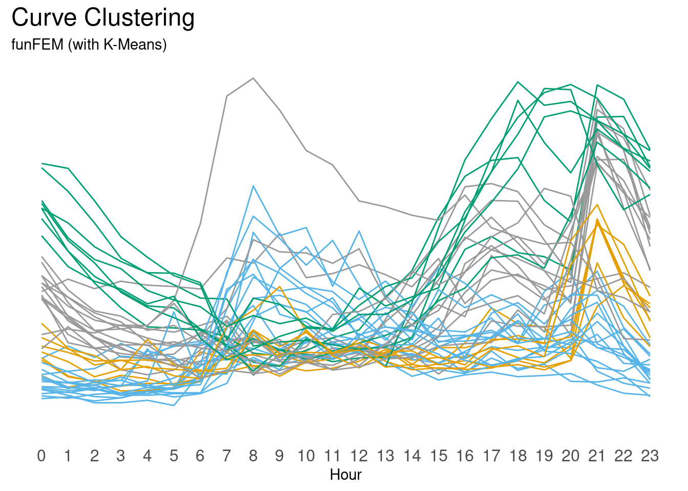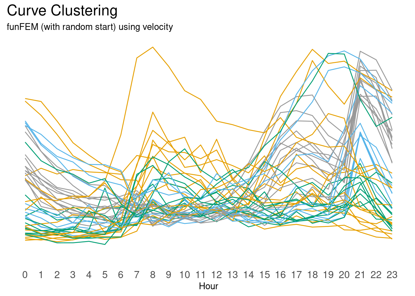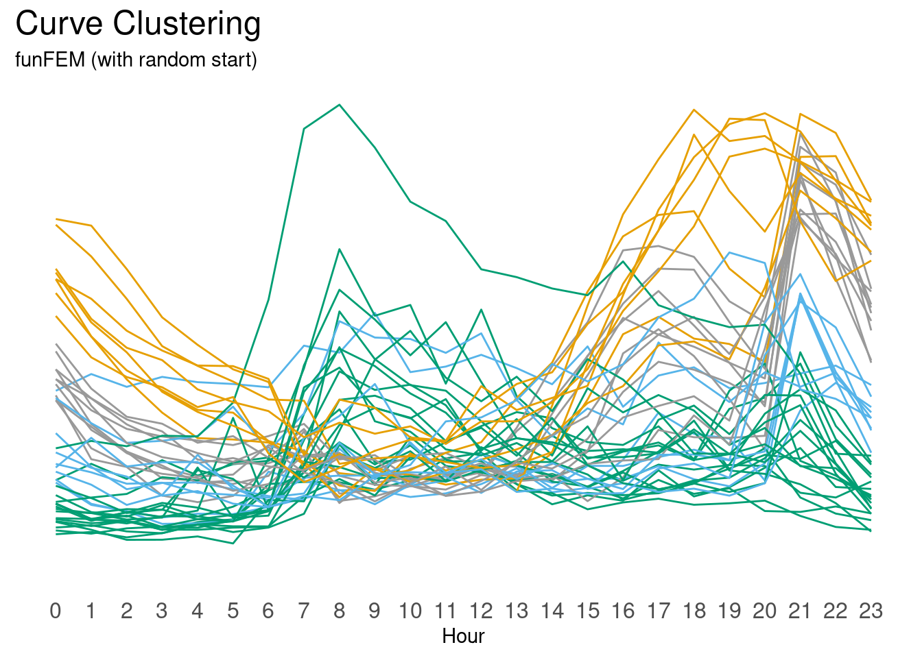 FDA provides an alternative approach, curve clustering. In this approach FDA first estimates a continuous curve using the 24 hours, then the curves themselves are the object of the [curve] clustering algorithm. There are different curve clustering algorithms. The results of which may mirror those of a traditional clustering technique while the results of others will differ.
