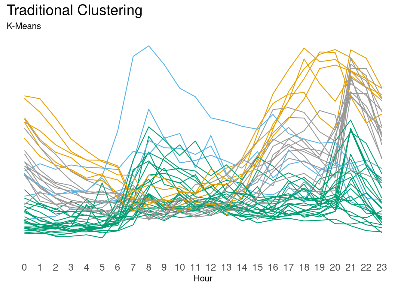 Below are results of a traditional clustering process using K-means followed by a curve clustering algorithm.