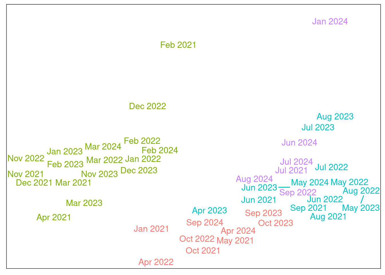 What do you think? Does the plot make sense? The coldest months appear to be in the top left corner, summer months in the top right corner, spring and fall in the middle, and two outliers perhaps towards the bottom of the graph.