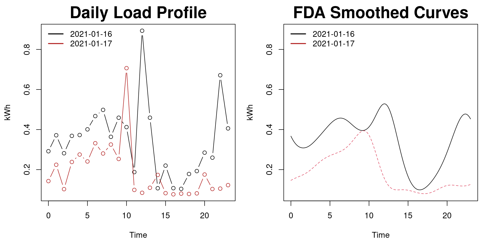 Using FDA we’ll first derive smooth approximations of the data, one curve per day. The figures below illustrate the curve-fitting process. The figure on the left shows the daily load profile for two days while the second shows the FDA-fitted curves. Notice that the fitted curves are smooth and capture the essence of the data but don’t necessarily capture it’s peakedness - you might say the curves aren’t over-fitted.