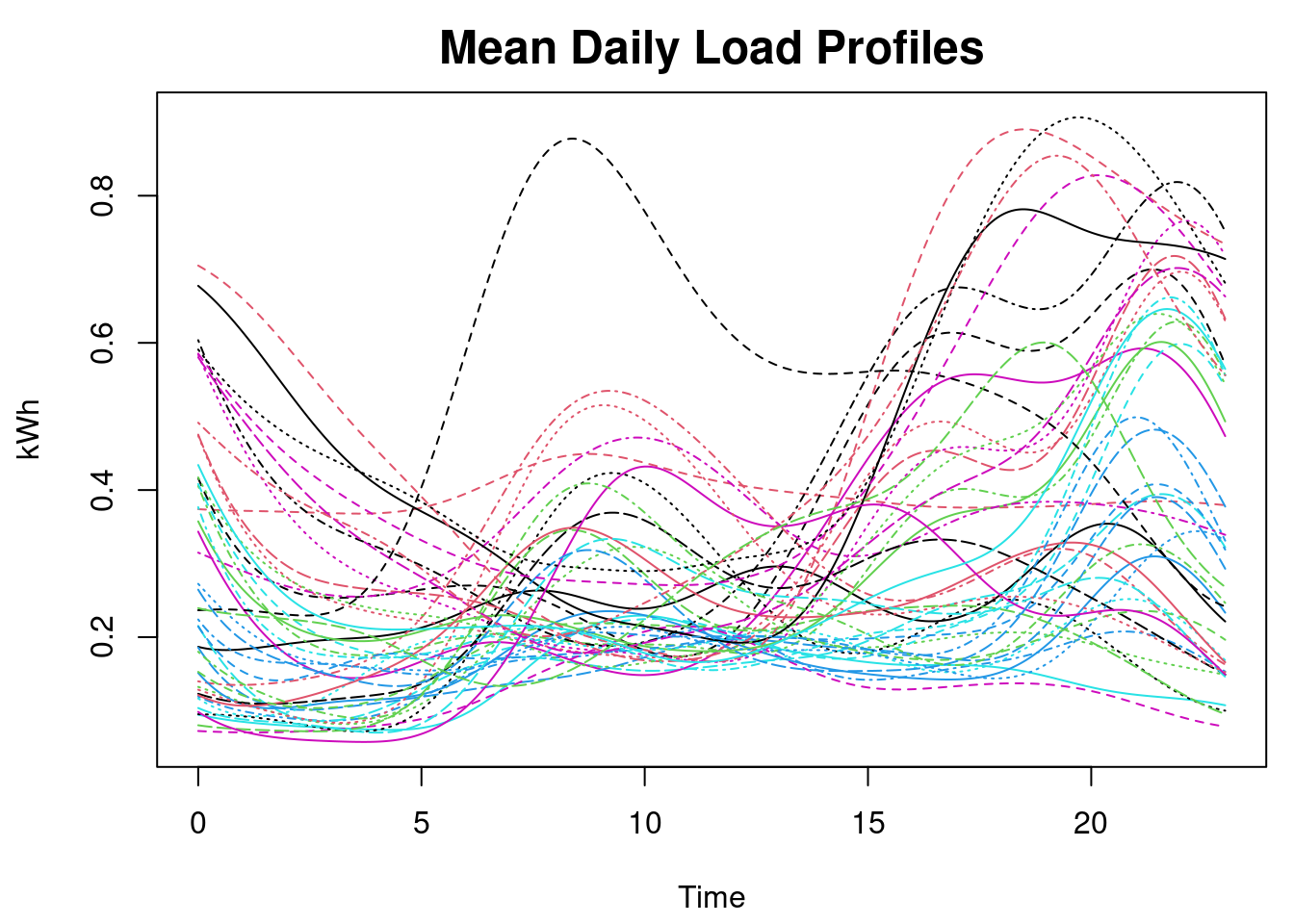 Regarding computational efficiency. FDA is fast. I’m able to fit curves to the 1,343 days in this analysis and summarize said curves in minutes using modest resources. To fit the curves I use distributed resources; machine 1: 16Gb RAM with 4 cores and machine 2: 8Gb RAM with 8 cores. This works well for the size of my data. However, if I planned to analyze years worth daily/hourly/15-min energy consumption data for millions of customers then fitting a curve to each day might not be the optimal strategy.