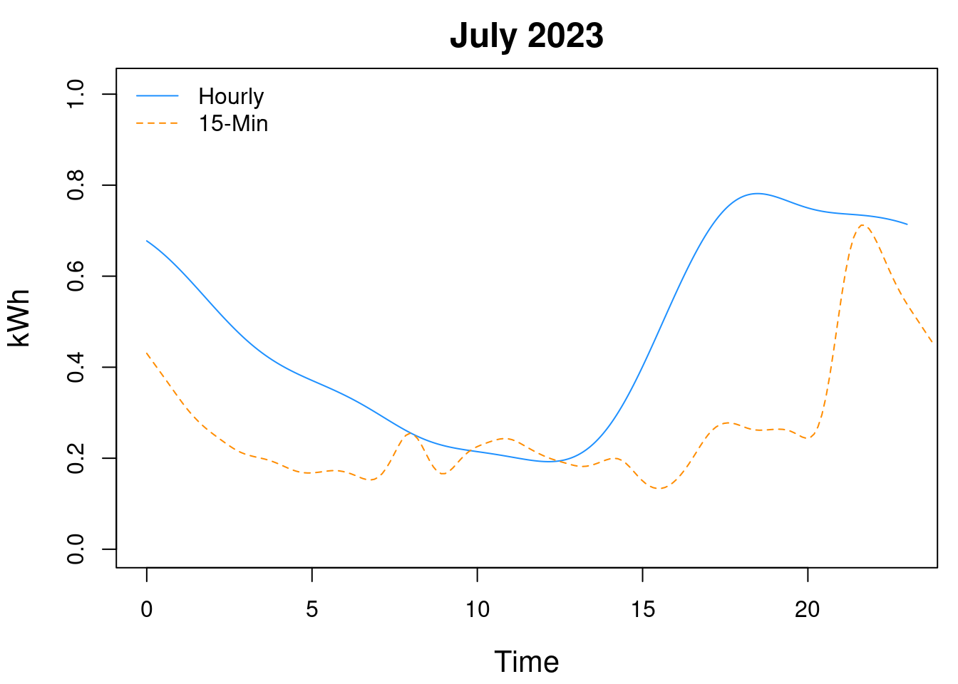 Next, the figure below illustrates the summarized curve of a randomly chosen month. The summarized hourly curves are the focus of our discussion in this article. However, I was curious to see what effect summarizing the 15-minute interval data by hour would have. To accomplish this, I also fit curves to each day on the 15-minute data. Then, as before, I summarized the fitted-curves by month. As expected, smoothing the 15-minute data results in a loss of information. For example, the magnitude of the tallest peak is lessened and shifted. Overall, though, I think the smoothed data fits well enough.
