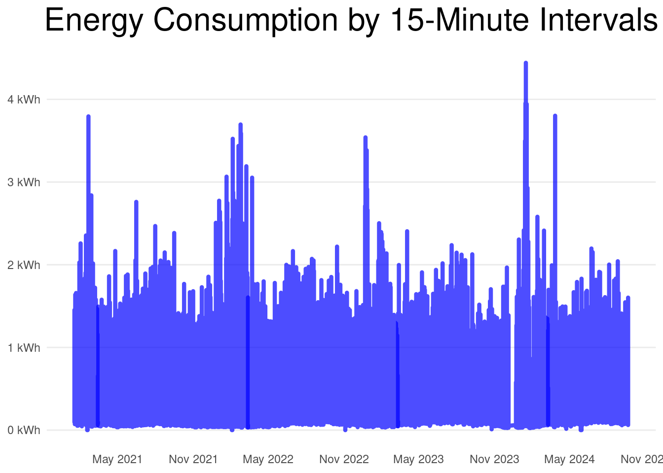 The data for this article represents my household’s energy consumption and consists of 15-minute interval meter readings. The start of the period is 2021-01-16 and the end of the period is 2024-09-20 for a total of 1,343 days and 45 months.