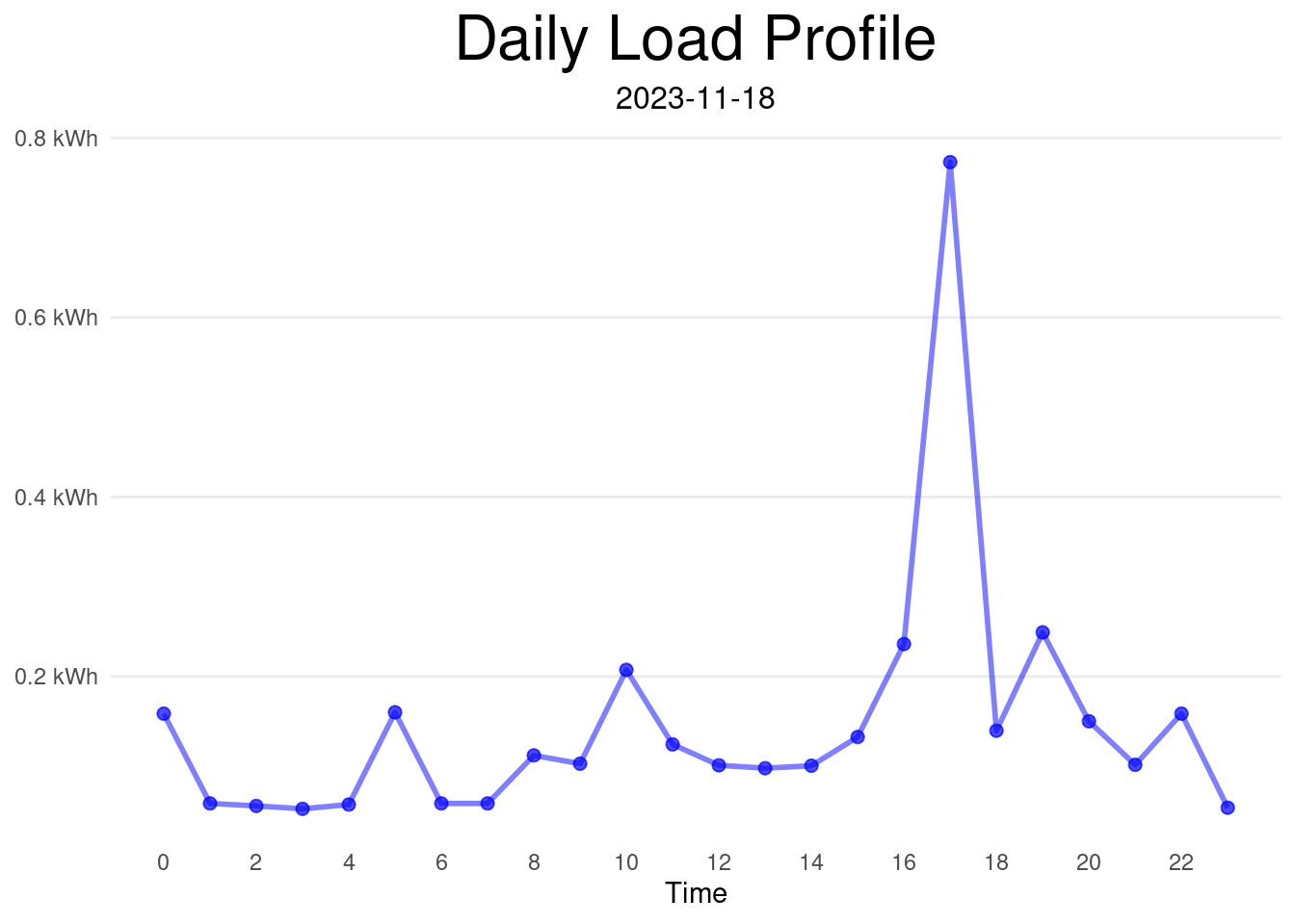 The hierarchy of nesting days within months allows us to analyze each day separately or to analyze many days at once via a summary of the data, such as the mean of various days (e.g., the mean of all the days in January 2021). Below is an example of a daily load profile from a randomly chosen month.